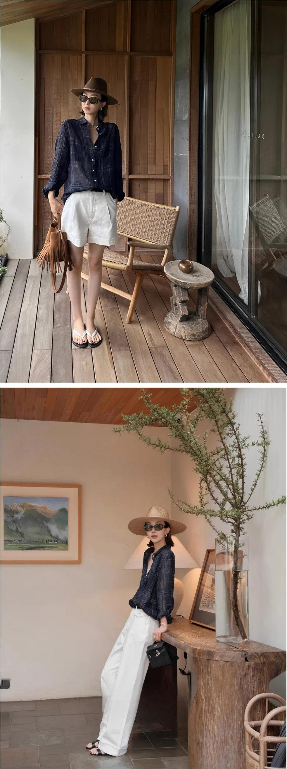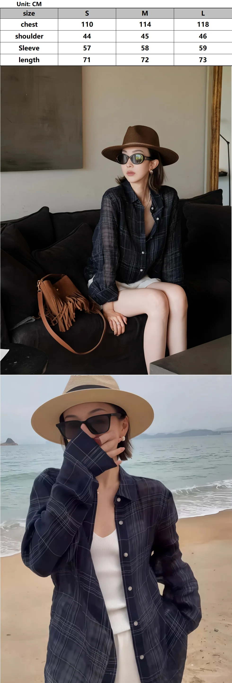 Blue Plaid Shirt 2025 Summer Women's Thin Sun Protection Cardigan Linen Plaid Shirt Women's Long-Sleeved Top